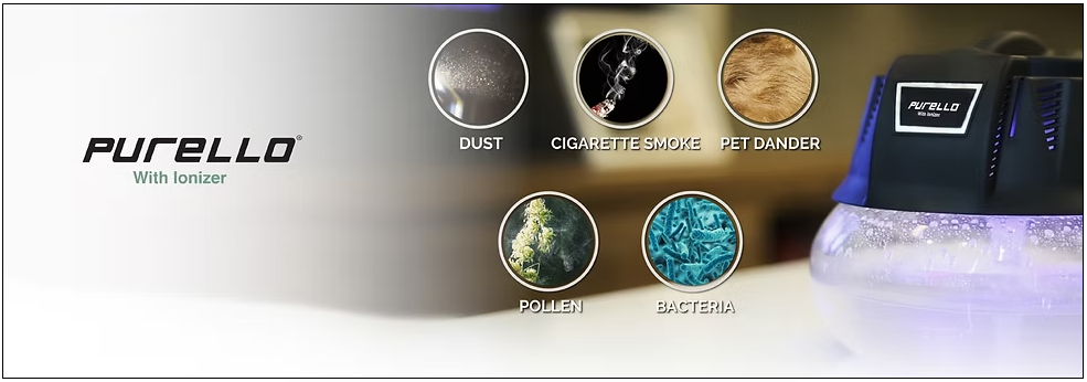 Purello 释放负离子,有助于清除灰尘、香烟烟雾、宠物皮屑、花粉、霉菌孢子、病毒和细菌,对健康有益